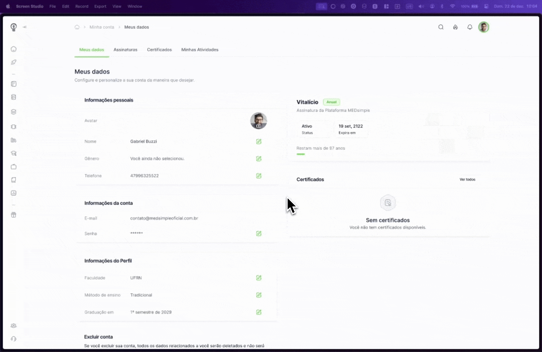 Observação: Por motivos de segurança, a alteração do endereço de e-mail associado à conta não é permitida diretamente pela plataforma. Para solicitar a mudança do seu e-mail cadastrado, entre em contato com o suporte da MEDsimple pelo e-mail contato@medsimpleoficial.com.br.